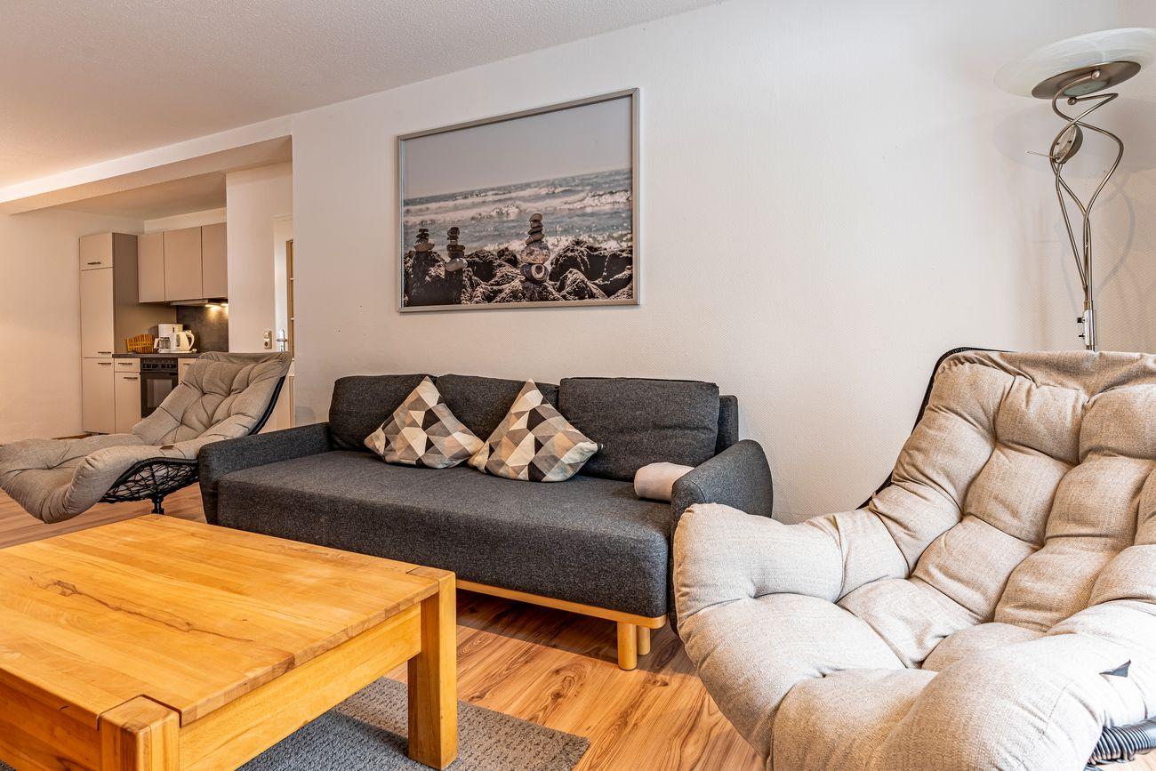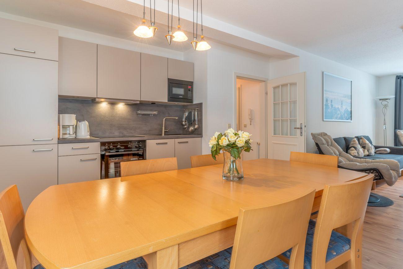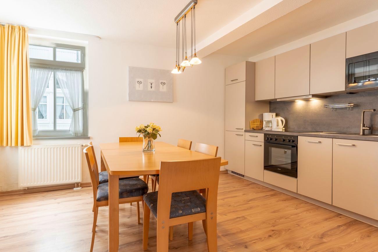 Unser 2- Raum Apartment bietet auf 59 qm Platz für bis zu 4 Personen. Im Wohn/Essbereich ist eine umfangreich ausgestattete Küchenzeile integriert.