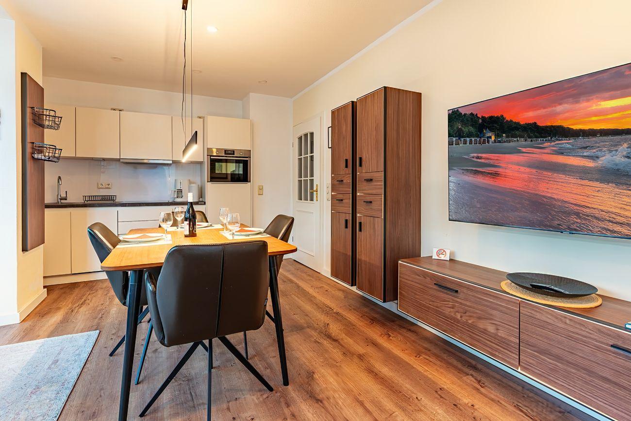 Im Wohn/Essbereich ist eine umfangreich ausgestattete Küchenzeile integriert. Ein Highlight davon ist die Desinfizierungsstation für alltägliche Gebrauchsgegenstände, z.B.  Handys, Fernbedienungen, Kinderspielzeug etc.