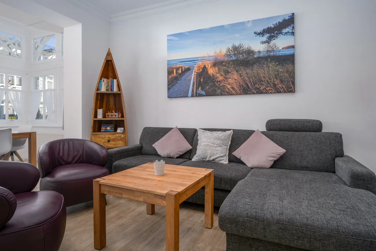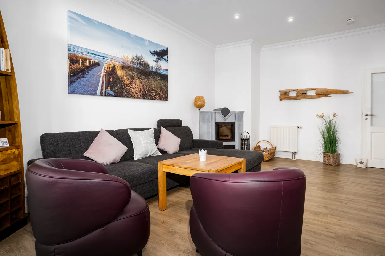 Im gemütlichen, mit Kamin ausgestatteten, Wohnzimmer ist eine zusätzliche Aufbettung auf dem Schlafsofa möglich. Der Wohnbereich ist zusätzlich ausgestattet mit TV, Blue-Ray Player und einer Stereoanlage.