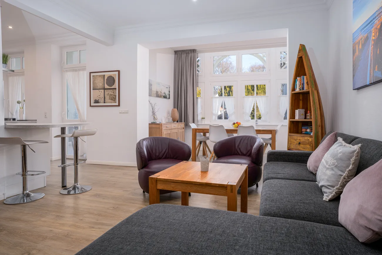 Unser 3- Raum Apartment bietet Ihnen gemütliche und moderne Wohnqualität. Die Ausstattung der Küche mit Espressomaschine, Mikrowelle, großer Kühl-/Gefrierkombination, Geschirr, Gläsern und weiteren Küchengeräten lässt keine Wünsche offen.
