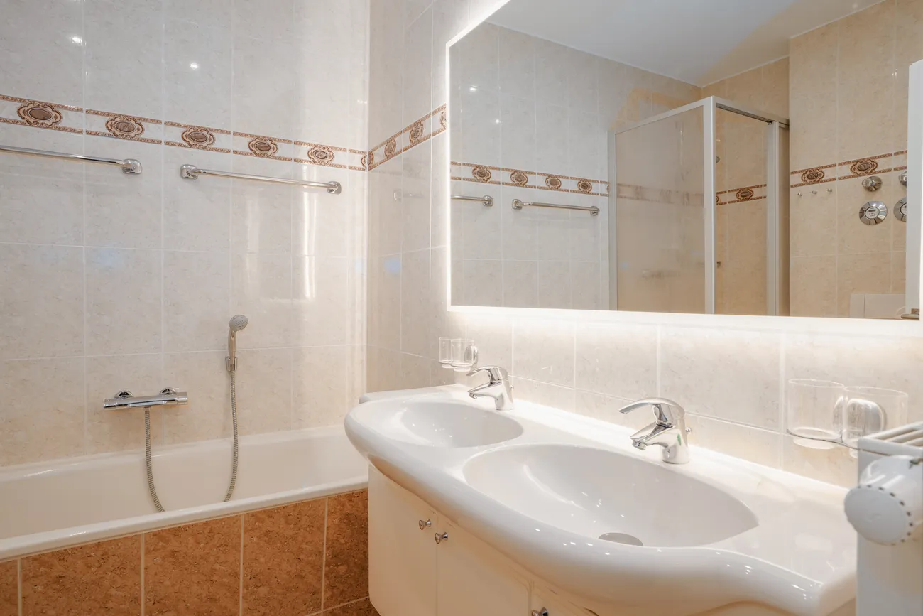 Das Bad ist mit Badewanne und Dusche ausgestattet. Ein zusätzliches Gäste – WC ist vorhanden.